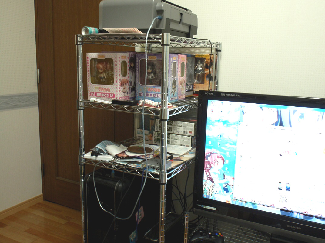 後、撮影したときにふと左上を見たら、棚がまどマギ関連の